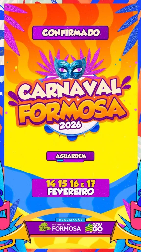 Com a confirmação, Formosa terá quatro dias de festa, programados para os dias 14, 15, 16 e 17 de fevereiro, oferecendo opções de lazer, cultura e entretenimento para moradores e visitantes.