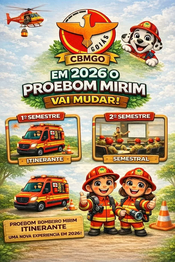 O Corpo de Bombeiros Militar do Estado de Goiás (CBMGO) anunciou a execução do Programa Educacional Bombeiro Mirim Itinerante (PROEBOM Itinerante) no primeiro semestre de 2026. A iniciativa tem como objetivo promover educação cidadã, prevenção de riscos, disciplina e valores sociais para crianças da rede municipal.