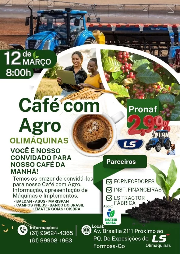Participe do Café com Agro em Formosa no dia 12/03. Conheça máquinas LS Tractor, implementos e taxas de Pronaf a 2,99%