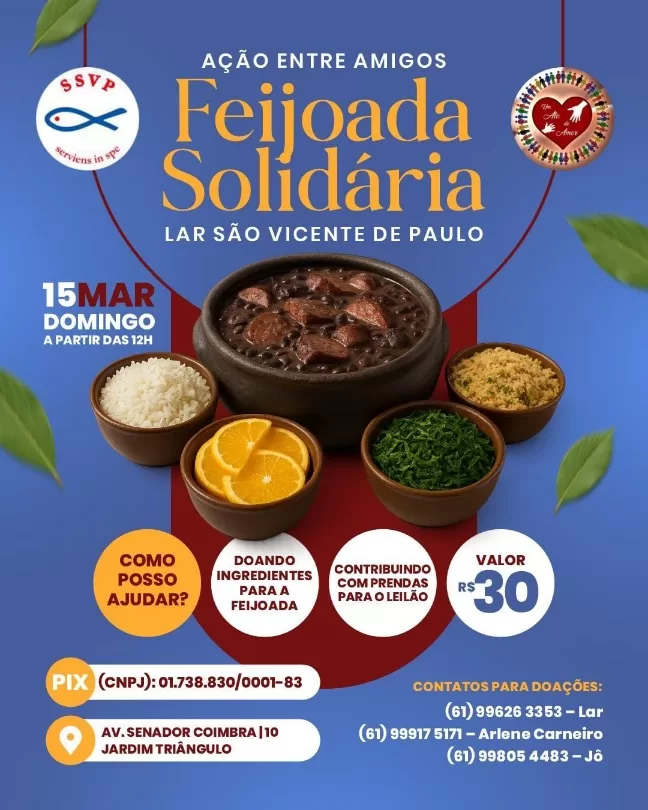 O evento acontece na Avenida Senador Coimbra, nº 10, Jardim Triângulo, e contará com uma feijoada completa, preparada com ingredientes em grande escala para atender a comunidade e colaboradores da causa. O valor da feijoada é de R$ 30, e toda a arrecadação será destinada ao Lar São Vicente de Paulo.