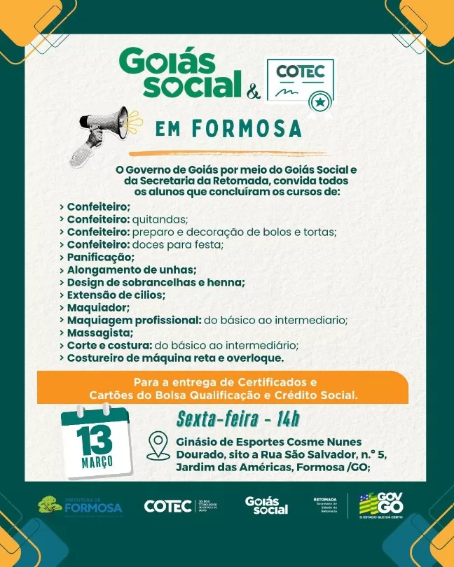 A Prefeitura de Formosa realiza nesta sexta-feira (13) uma cerimônia especial de entrega de certificados de cursos de qualificação profissional e dos cartões dos programas Bolsa Qualificação e Crédito Social. A iniciativa acontece em parceria com o Goiás Social e o COTEC – Colégio Tecnológico do Estado de Goiás.