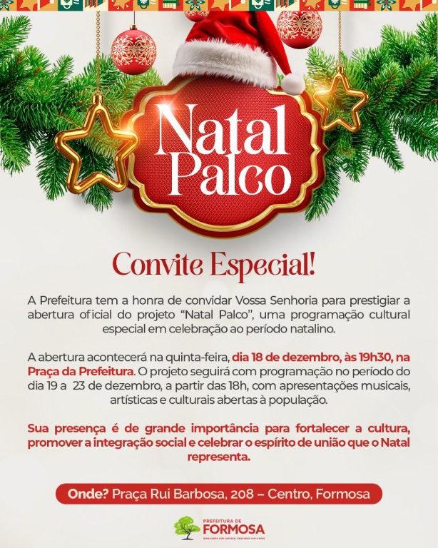 A Prefeitura de Formosa convida toda a população para participar da abertura do projeto “Natal Palco”, uma programação especial preparada para celebrar o período natalino com muita cultura, música e integração social.