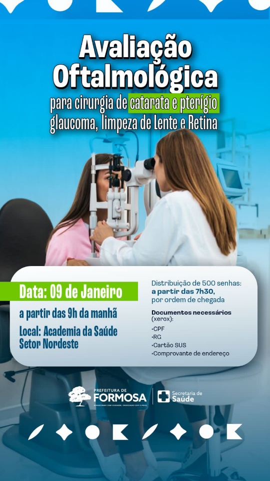 Prefeitura de Formosa realiza avaliação oftalmológica gratuita nesta sexta-feira (9), com triagem para catarata, pterígio e exames de glaucoma, na Academia da Saúde.